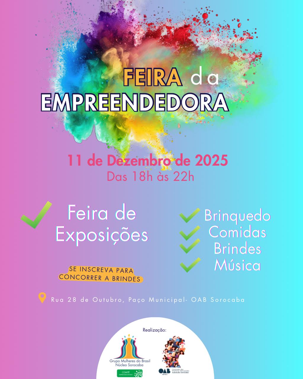Parabéns a todas as empreendedoras que participaram com tanto talento e dedicação, e a todos os envolvidos, apoiadores e patrocinadores – Grupo Mulheres do Brasil, OAB Sorocaba, Semear XYZ, Sebrae, Acso Mulher, CIM Mulher, Comissão das Mulheres Advogadas, Secretaria da Mulher de Sorocaba e todos os patrocinadores por fazerem desta feira um marco de inspiração.